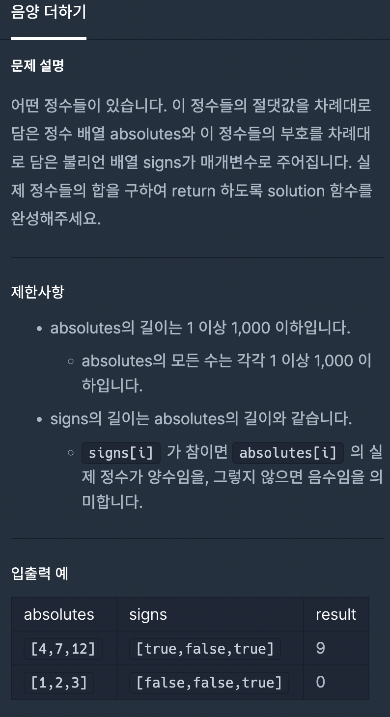 코딩테스트 연습 - 음양 더하기
