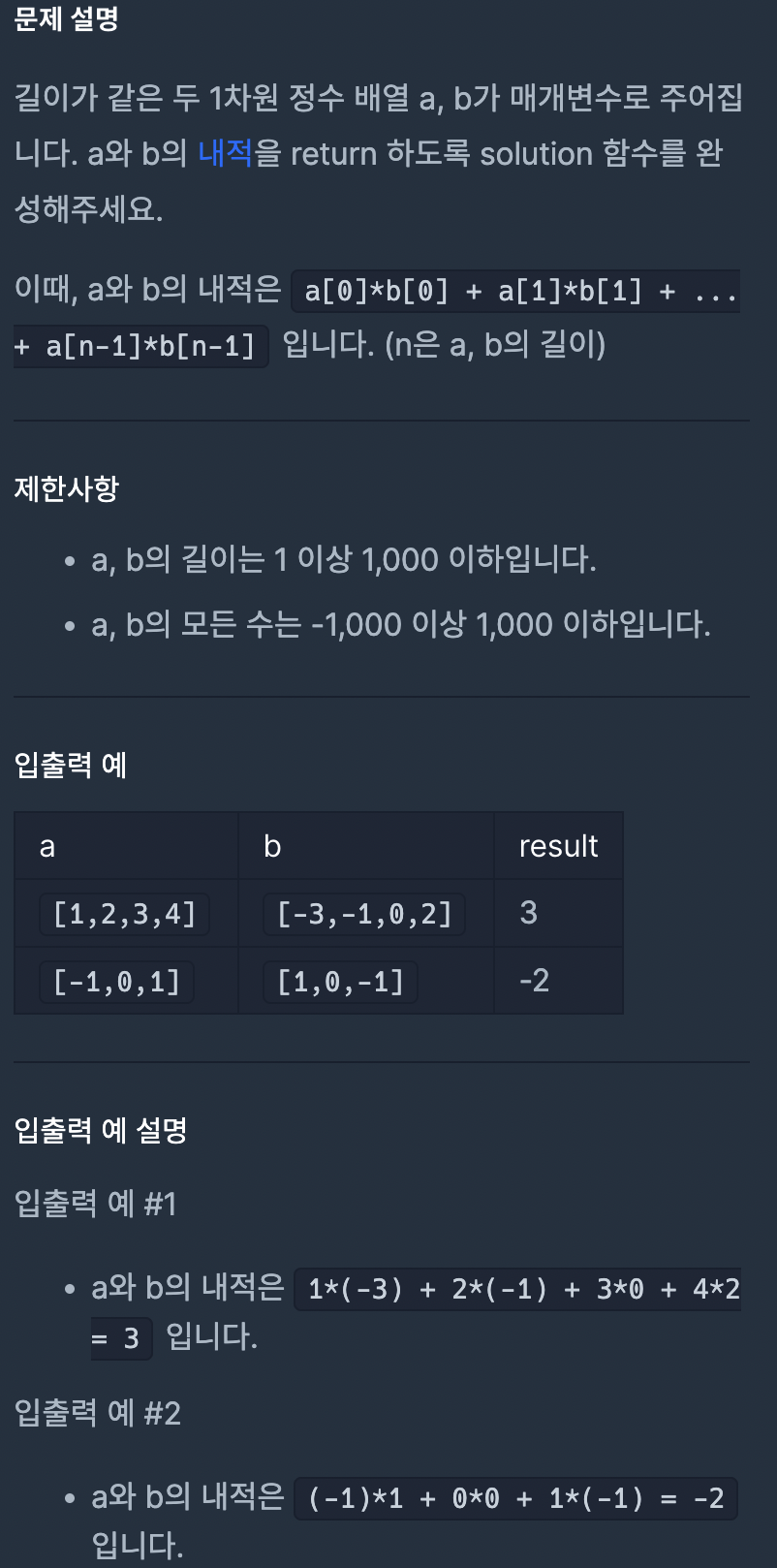 길이가 같은 두 1차원 정수 배열 a, b가 매개변수로 주어집니다. a와 b의 내적을 return 하도록 solution 함수를 완성해주세요. 이때, a와 b의 내적은 a[0]*b[0] + a[1]*b[1] + ... + a[n-1]*b[n-1] 입니다. (n은 a, b의