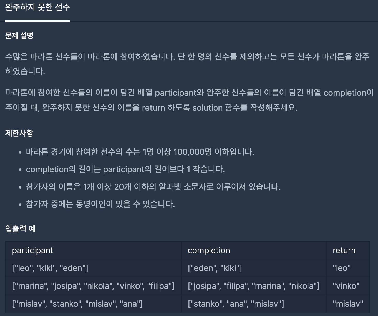 참가자가 완주를 했으면 -1을 해줌으로 0이되고 중복 참여(동명이인)를 했는데 그 중 일부만 완주하면 1이상이 된다.