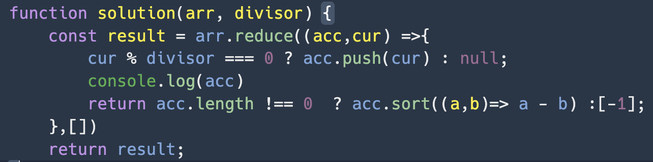 이렇게 하면 배열의 마지막 요소 전까지는 나누어 떨어지면 acc 배열안에 추가가되고 안되면 null이니까 pass되고