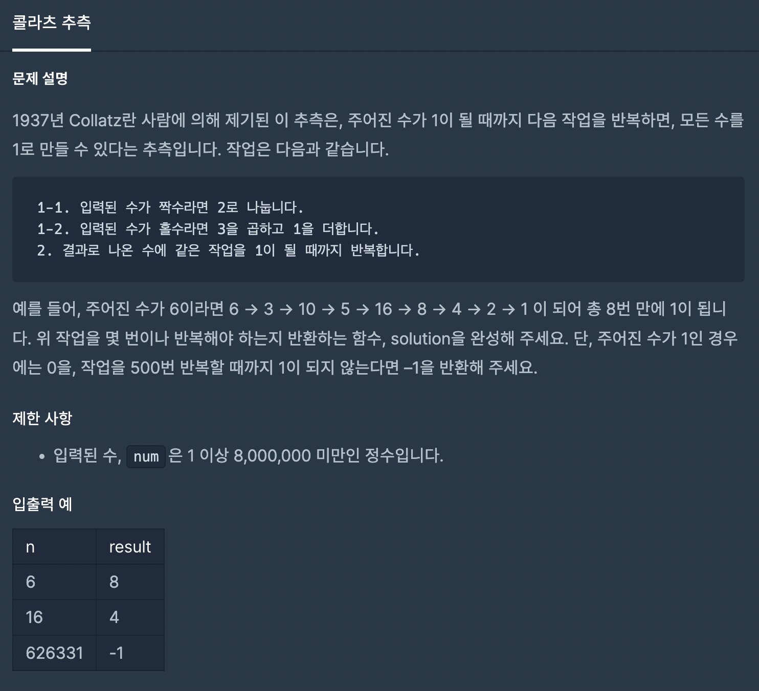첫 번째 if( num == 1) return 0 이렇게 하면 주어진 수가 1인경우에 0을 정상반환하지만 주어진수가 8번만에 1된다면 그때도 0을 반환하기에 처음 1이 주어진 것을 표시하기위해 index == 0 이라는 조건도 추가해주었다.