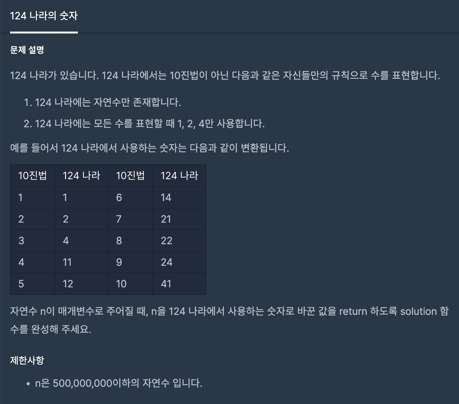 마지막으로 결과값의 모든 3을 4로 바꿔준다 왜냐면 124나라는 오직 1, 2, 4만 숫자로 쓸 수 있기 때문이다.