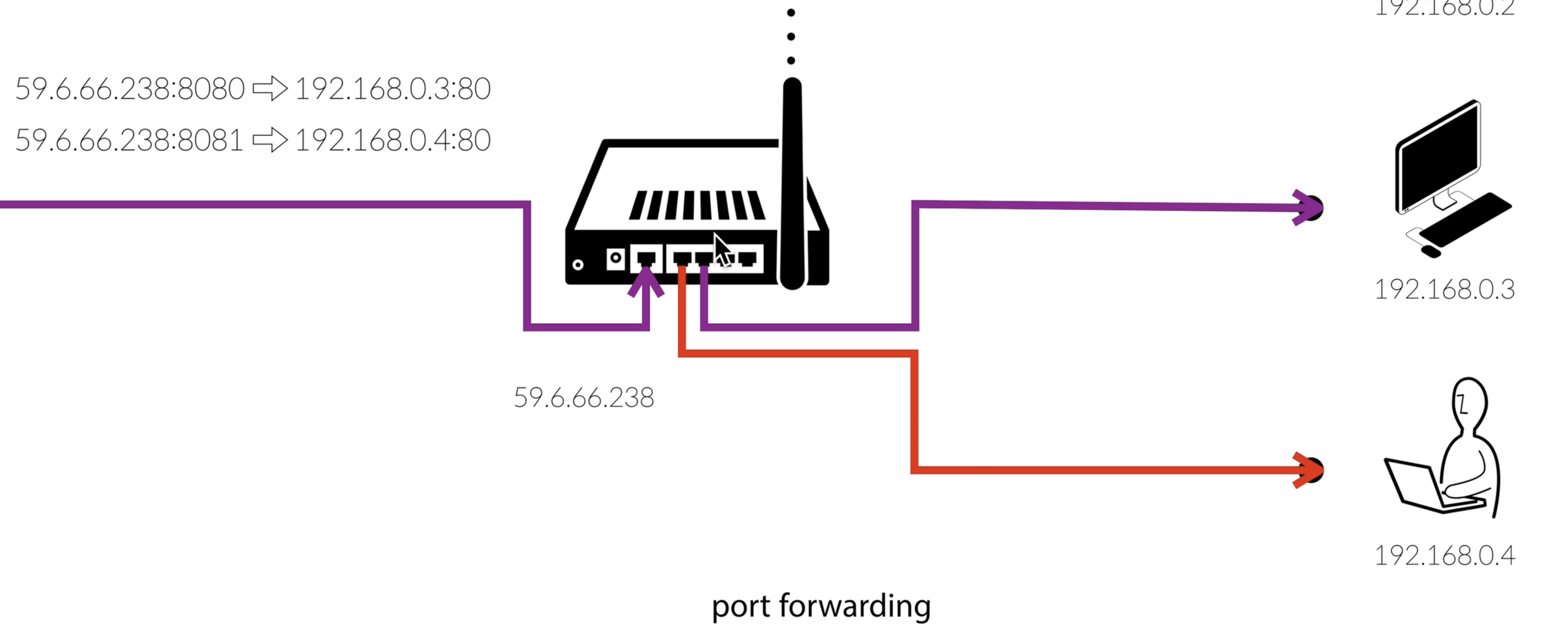 제 3자가 59.6.66.238:8081로 접속이들어오면 192.168.0.4:80으로 연결 되게 설정해주는게 바로 port forwrding이다.