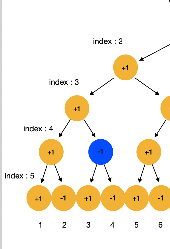 그리고 dfs(4,2)는 빨간색함수인 dfs(5,3)를 호출하고 index가 5이기에 return으로 종료되고 바로 파란색함수가 호출된다. dfs(5,1)이 호출된다. (아래그림)