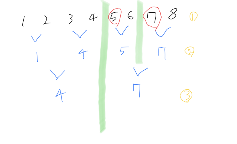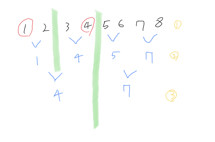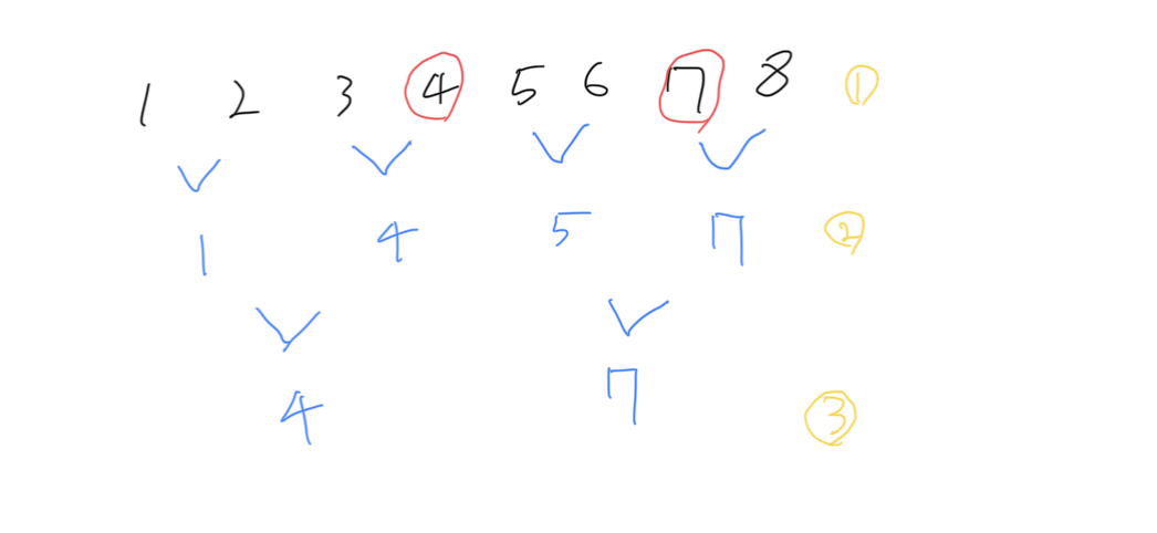 7, 8 에서 7이 이기면 다음번에 번호는 b/2 = 7/2 = Math.ceil(3.5) = 4