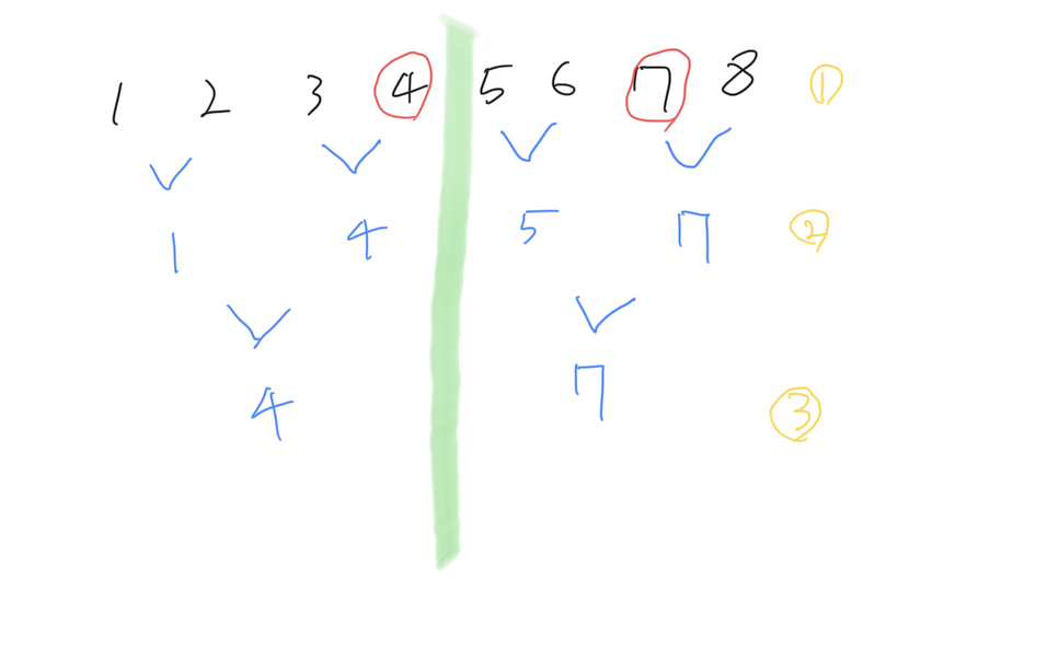 처음에 n/2 = 4이다 . 따라서 둘다 1번의 경우이다.