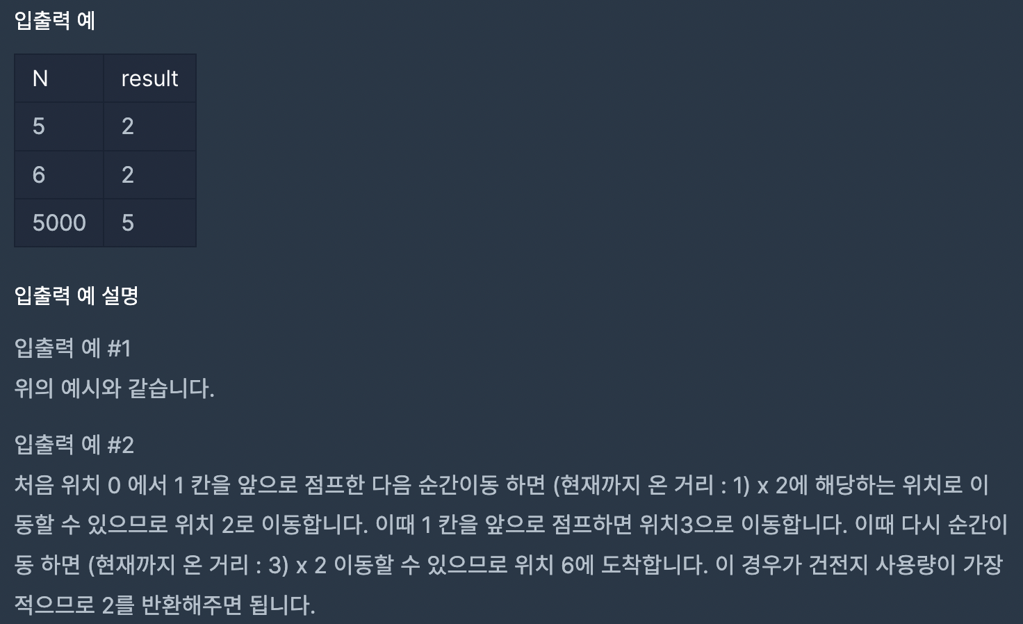 순간이동으로 거리가 초과하면 안된다. 따라서 순간이동을 사용하면 무조건 짝수 거리가 나오기에 마지막에 무조건 점프를 써줘야한다.