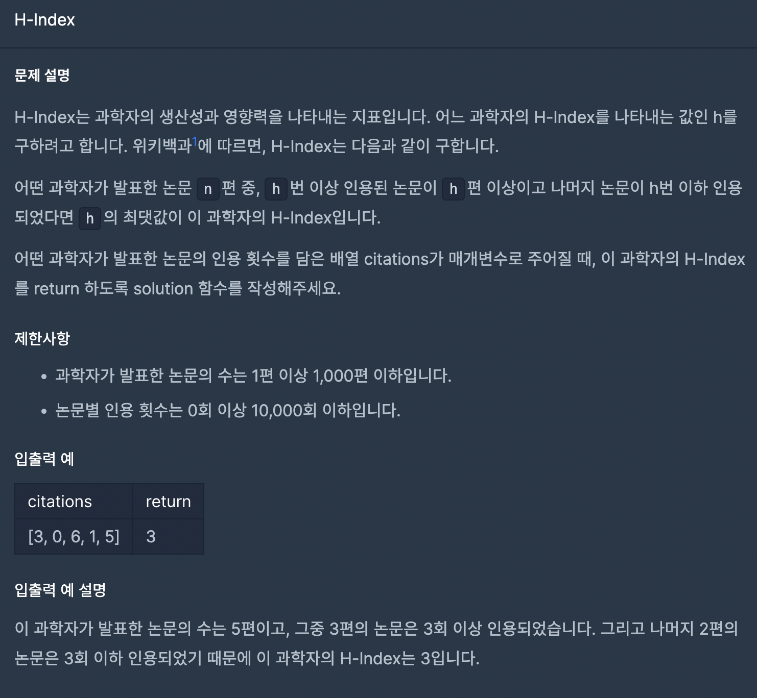 "논문 n편 중, h번 인용된 논문이 h편 이상이고 나머지 논문이 h번 이하 인용되었다면 h의 최댓값이 이 과학자의 H-index입니다. "