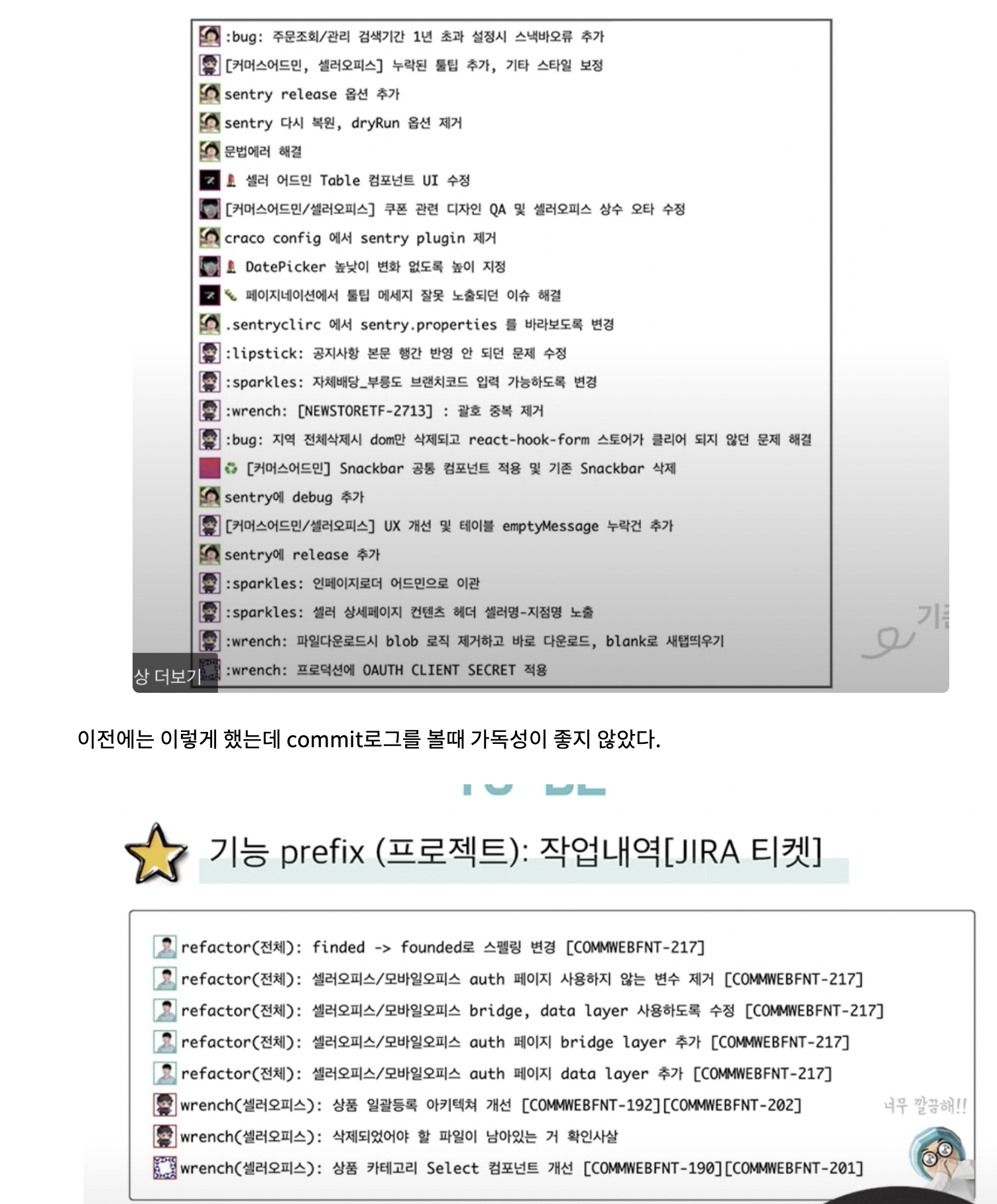 이전에는 이렇게 했는데 commit로그를 볼때 가독성이 좋지 않았다. 그래서 화면과 같이 제목을 작성하는 규칙을 만들어 가독성을 높였다고한다. 확실히 이전보다 가독성이 월등히 높아진 것 같다
