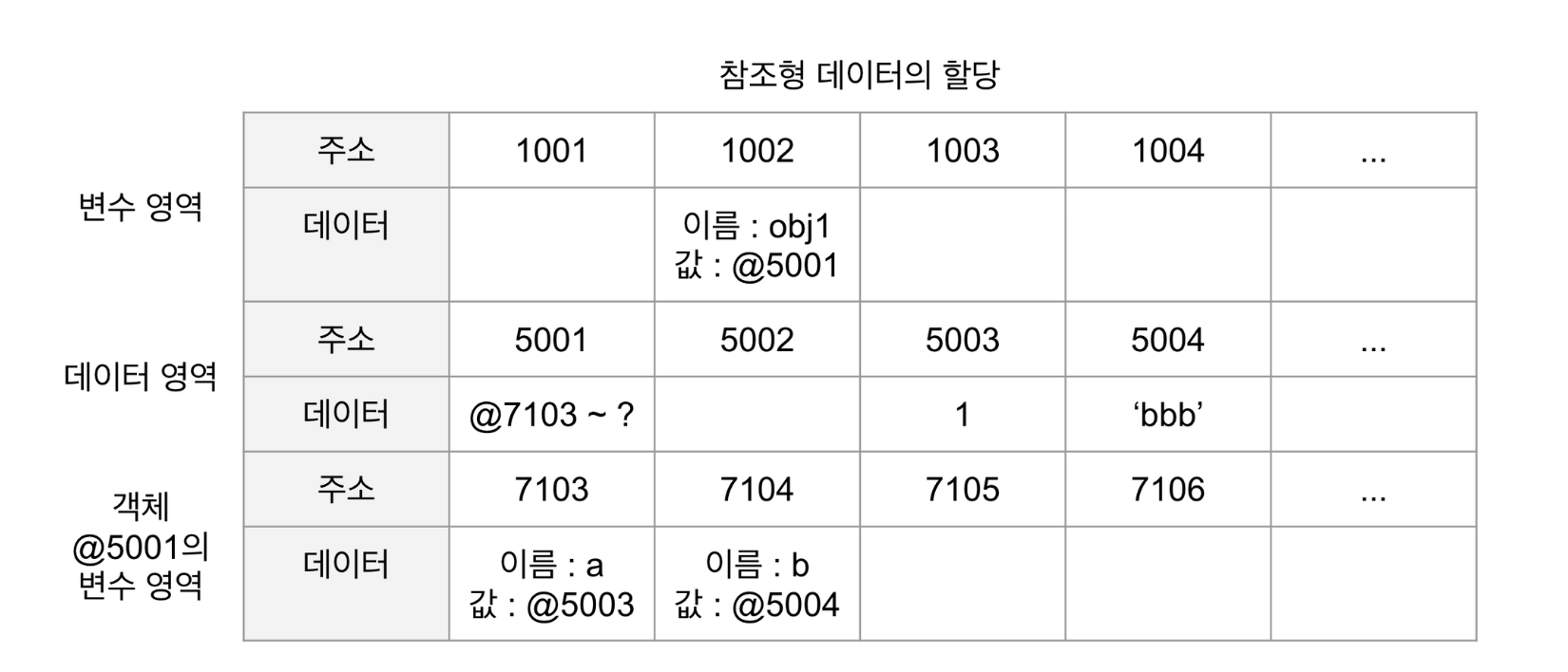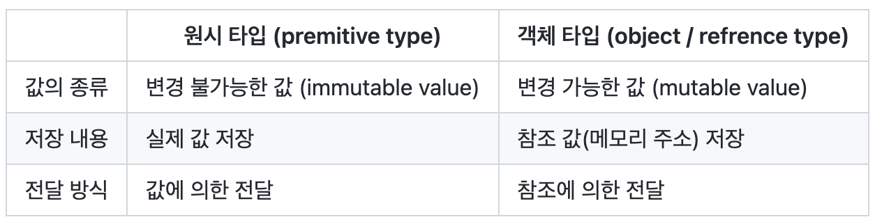 객체 타입의 변수들은 데이터 복사가 일어날 때 값이 담긴 주솟값을 바로 복사하지 않고, 값이 담긴 주솟값들로 이루어진 묶음을 가리키는 주솟값을 복사한다.