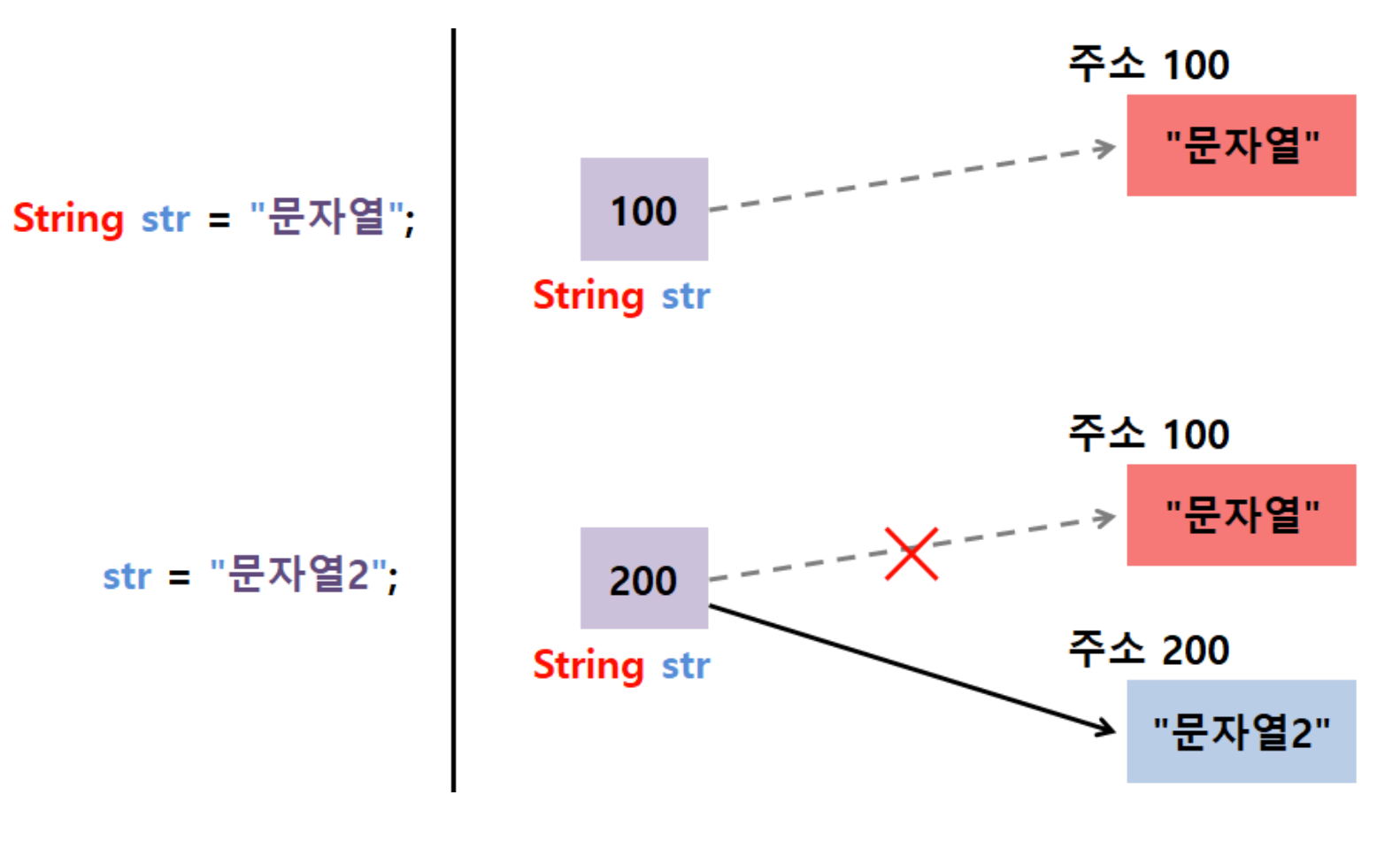 str에 "문자열"이라는 값을 할당한 후 "문자열2"라는 값을 재할당하면 새로운 메모리에 재할당한 값인 "문자열2"가 저장되고 변수가 그 메모리를 가리키게 되는 것을 알 수 있다.