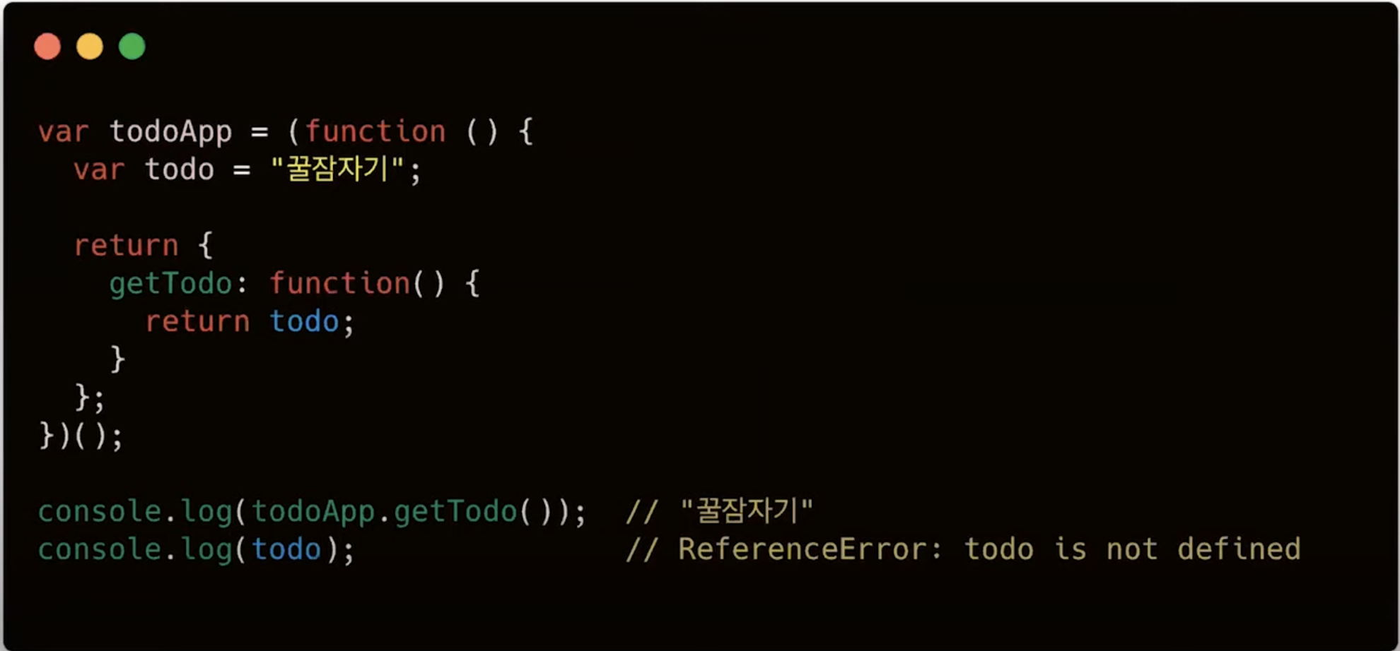 이러한 문제는 클로저의 원리를 이용하여 즉시실행 함수 등을 통해 구현한 모듈 패턴으로,