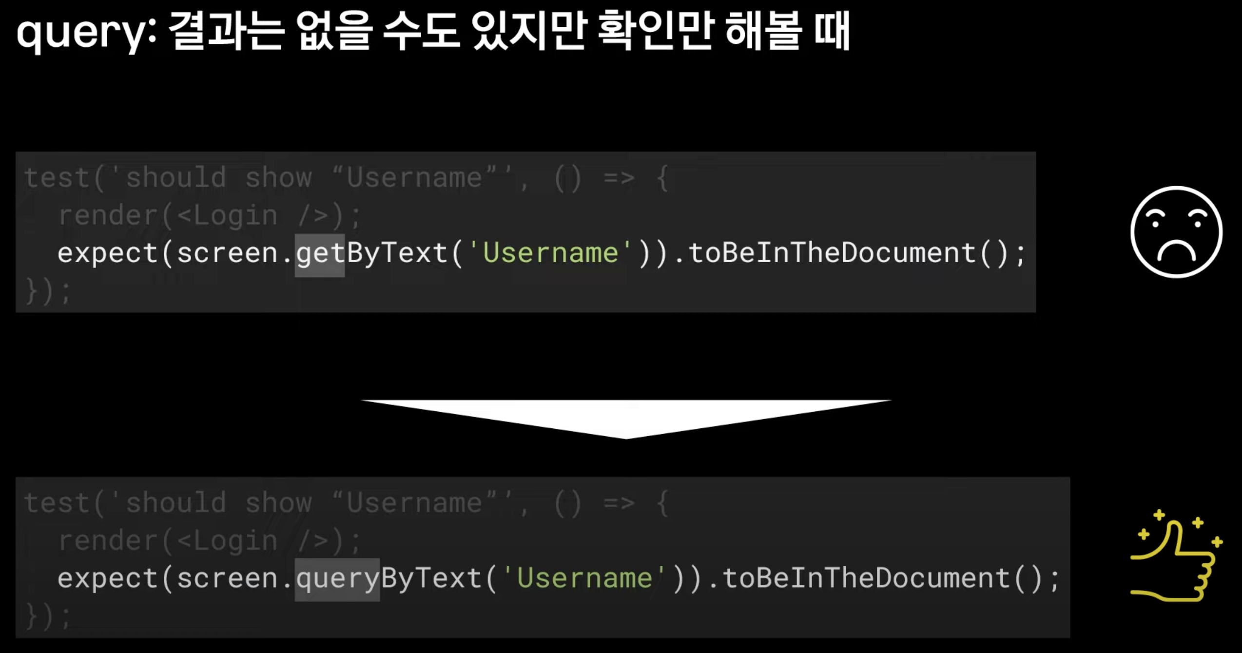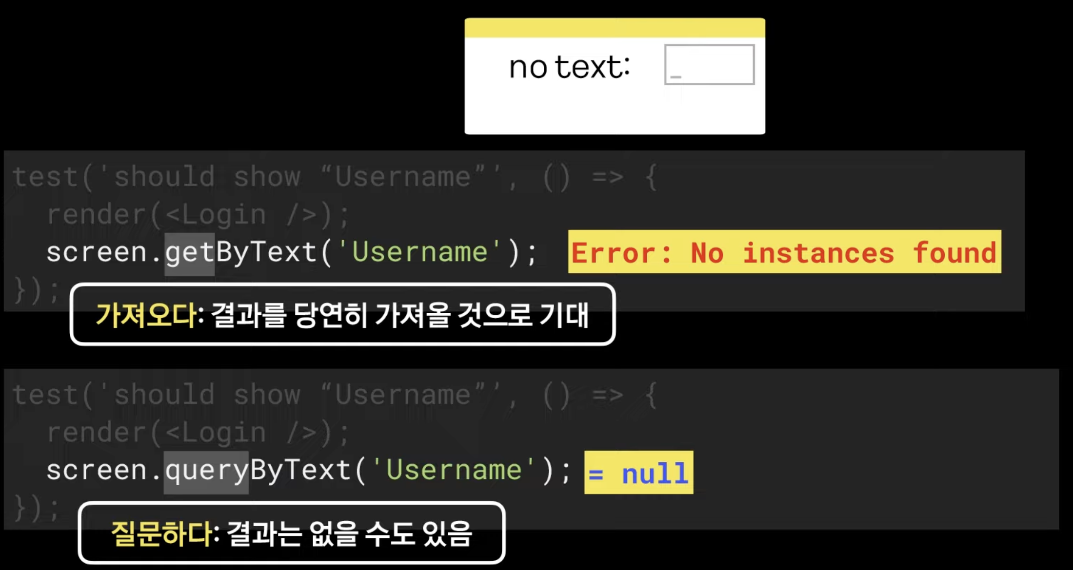 차이점은 getByText는 결과가 없으면 에러를 반환하고