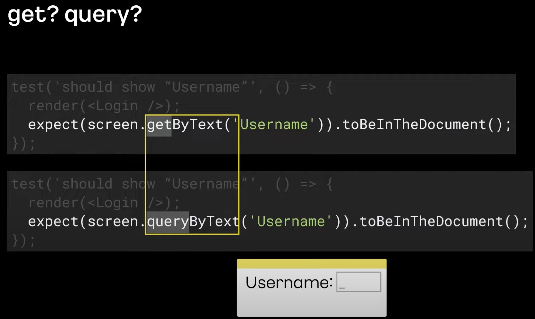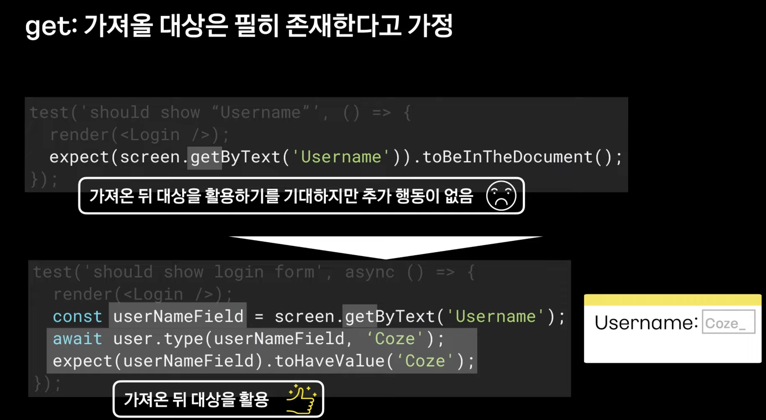 차이점은 getByText는 결과가 없으면 에러를 반환하고