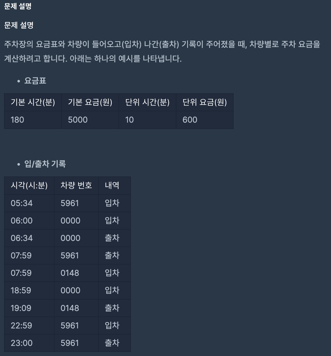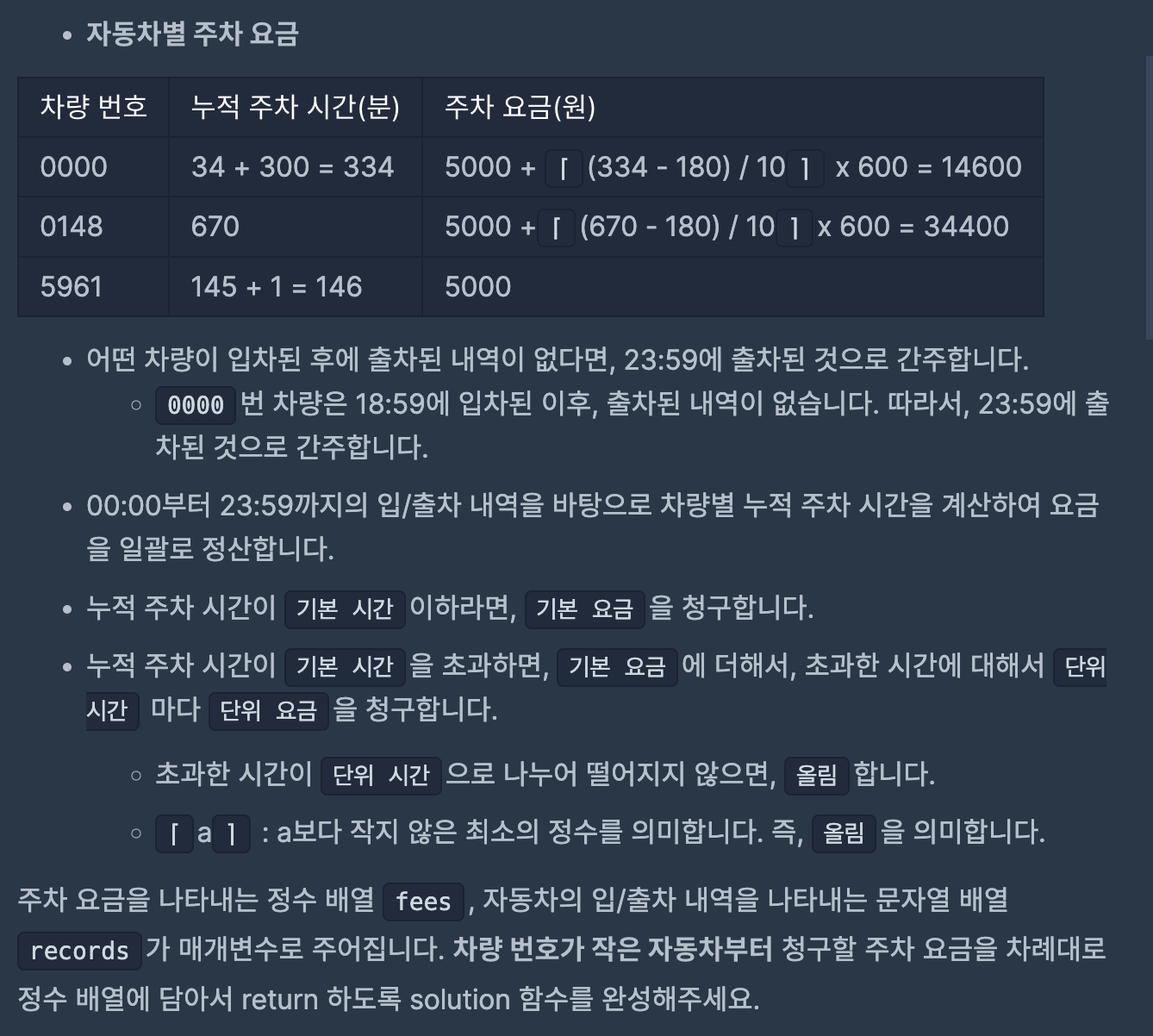 만약 out이면 그때 parkingData에 key를 차번호를 해주고 value를 passTime - carData[carNumber]로 해준다. (out이기에 여기서 passTime은 출차 시간이다.)