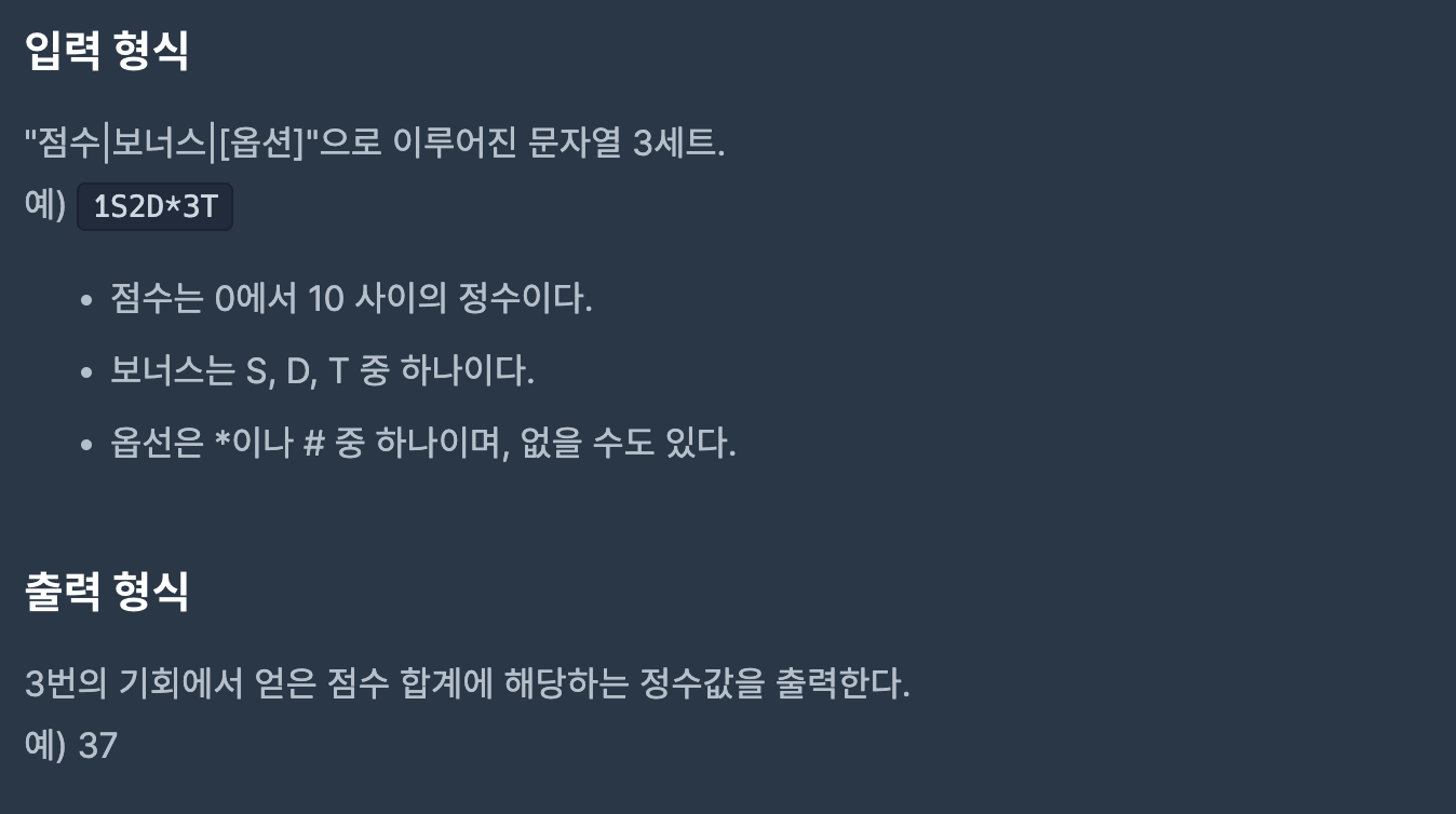 // 예를들어 '2D*' 이 값이 매개변수로 들어오면 2 = score, D = bonus, * = otion이 된다.