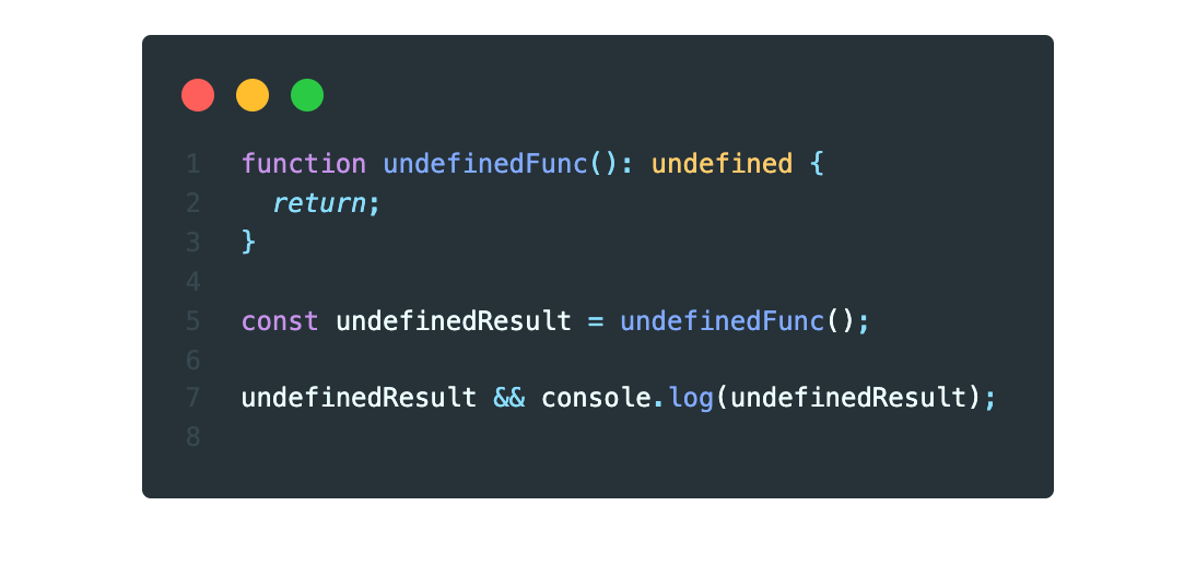 위 정의에서도 보았듯이 우리가 타입스크립트에서 함수를 작성하고 return을 하지 않는다면 알아서 void로 추론을 한다. 그리고 그러한 함수들의 반환 값은 undefined로 평가된다. 자바스크립트에서는 아무것도 반환하지 않는 함수는 암묵적으로 undefined 값을 반환한다. 하지만 타입스크립트에서 void와 undefined는 같은 것으로 간주되지 않는다.