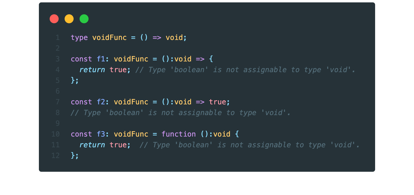 void를 반환하는 Contextual 함수 타이핑(식의 한변에만 타입을 지정하는것)은 함수에게 아무것도 반환하지 않을 것을 강제하지 않는다. 실제로도 아래 f1, f2, f3와 같이 값을 반환해도 아무런 타입 에러가 발생하지 않는다.