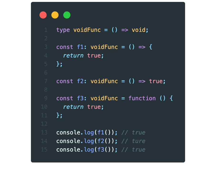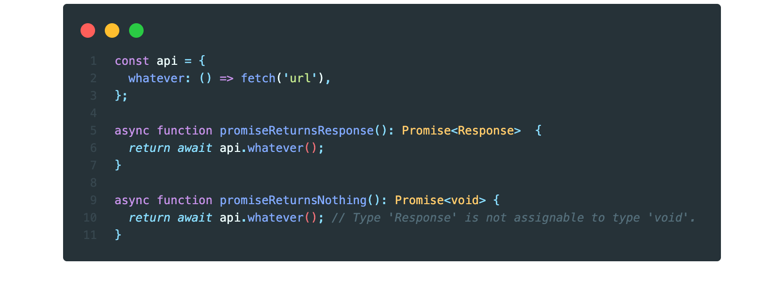 쉽게말해 타입스크립트가 아무런 제제를 하지 않고 그대로 void 타입이 아닌 값을 return 한다. (위 예제처럼 true를 return 함)