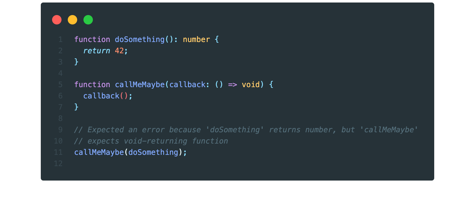 공식문서에서는 doSomething 함수의 반환 값인 숫자는 callMeMaybe 함수에서 요구하는 반환 값인 void보다 더 많은 정보를 가지고 있기 때문에 타입스크립트가 이러한 경우 타입 오류가 발생하지 않도록 처리한다고 한다.