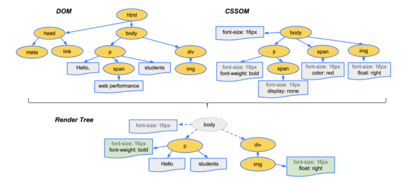브라우저 뷰 포트에 보이는 것은 렌더 트리로 DOM과 CSSOM의 조합입니다. 렌더 트리는 오직 렌더링 되는 요소만 관련이 있고 스크린에 그려지는 것으로 구성되어 있어 시각적으로 보이지 않는 요소들은 제외되기 때문에 DOM과는 다릅니다.