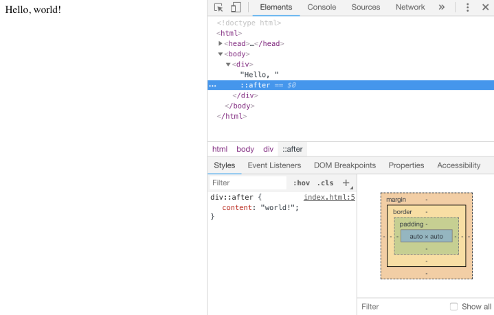 ::before과 ::after 선택자를 사용하여 생성된 가상 요소는 cssom과 렌더 트리의 일부를 구성하지만 DOM은 오직 원본 HTML 문서로부터 빌드되고, 요소에 적용되는 스타일을 포함하지 않기 때문에 기술적으로 DOM의 일부는 아니다.