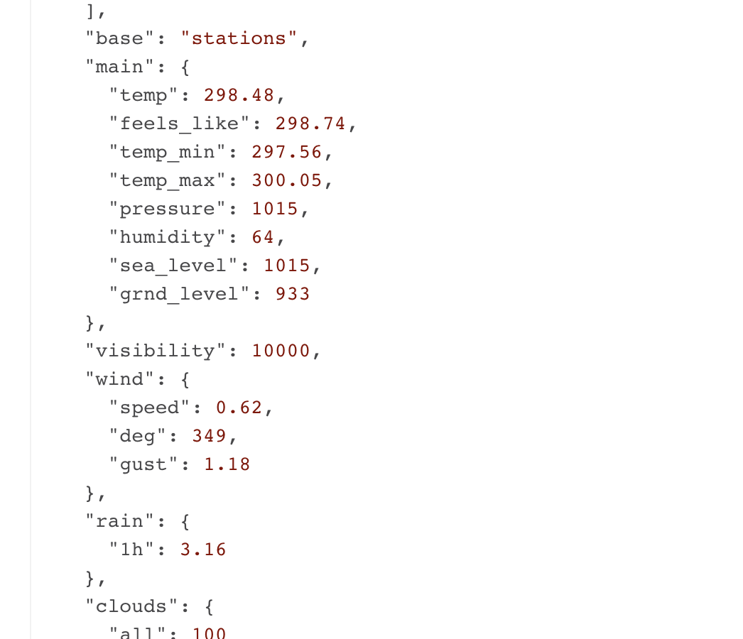 우리가 직접 그 지역에가서 온도를 측정하고 바람을 측정하고 구름의 정도를 측정할 필요없이 API에게 요청하면 이렇게 데이터를 바로 가져다 줍니다.