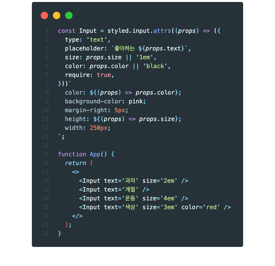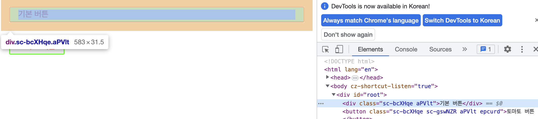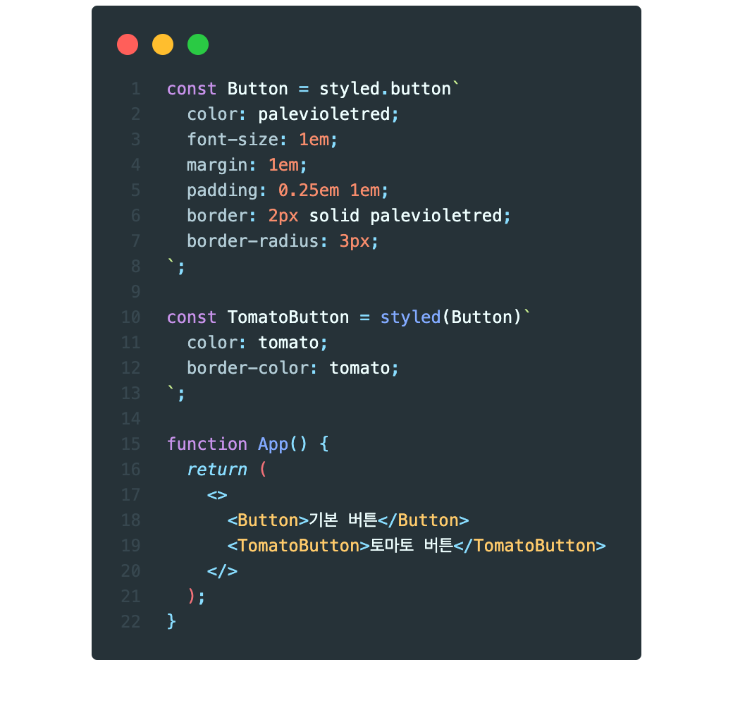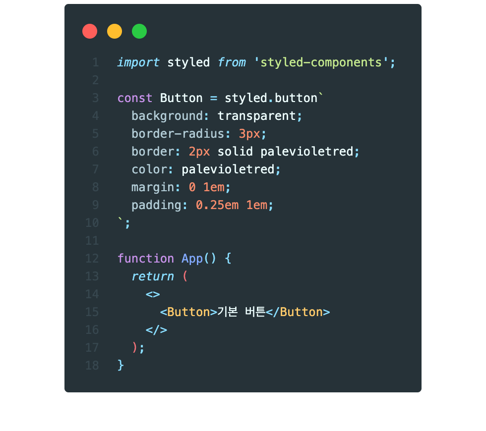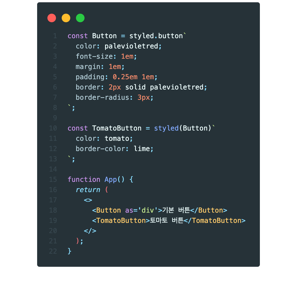 - styled.button 으로 입력하면 html 태그중에 button을 가리키는 것이고 styled.div로 입력하면 div 태그를 나타냅니다.