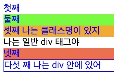 맨 처음 <Thtin> 태그를 제외하고 다음 <Thing>태그가 있는 곳 까지를 가리킵니다. 즉 중간에 div 태그가 껴있다면 그 전에있는 <Thing>태그까지만 적용됩니다. (둘째, 셋째)