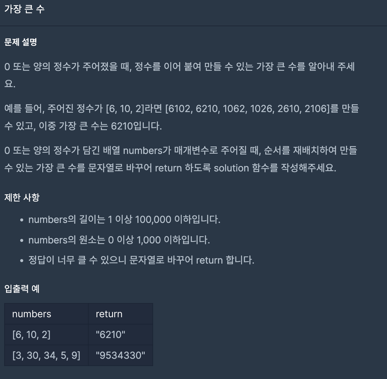 처음 생각은 아 모든 numbers를 조합해서 배열로 만든 뒤 Math.max()로 가장 큰 수를 찾아야 겠다.