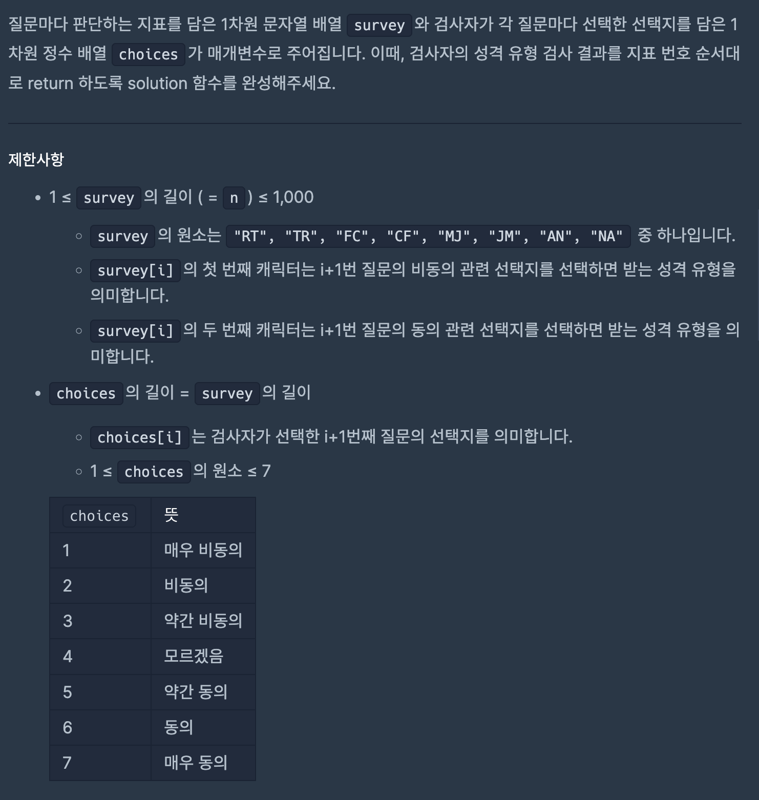 // survey 왼쪽 캐릭터의 점수를 4 - choices[i] 만큼 올린다.