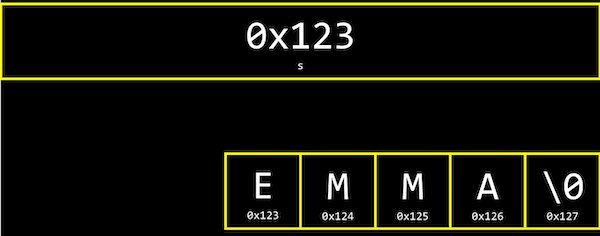 char*s에서 s라는 변수는 문자에 대한 포인터가 되고, "EMMA"라는 문자열의 가장 첫 번째 값을 저장하게된다.
