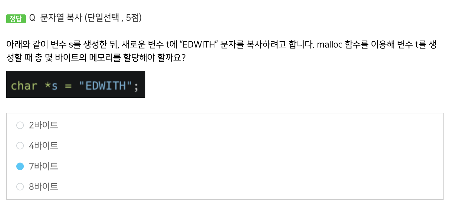 문자 하나당 1바이트가 필요한데 "EDWITH"는 6글자라 6바이트지만 종단문자(\O)까지 포함되기에 7바이트가 피룡하다.