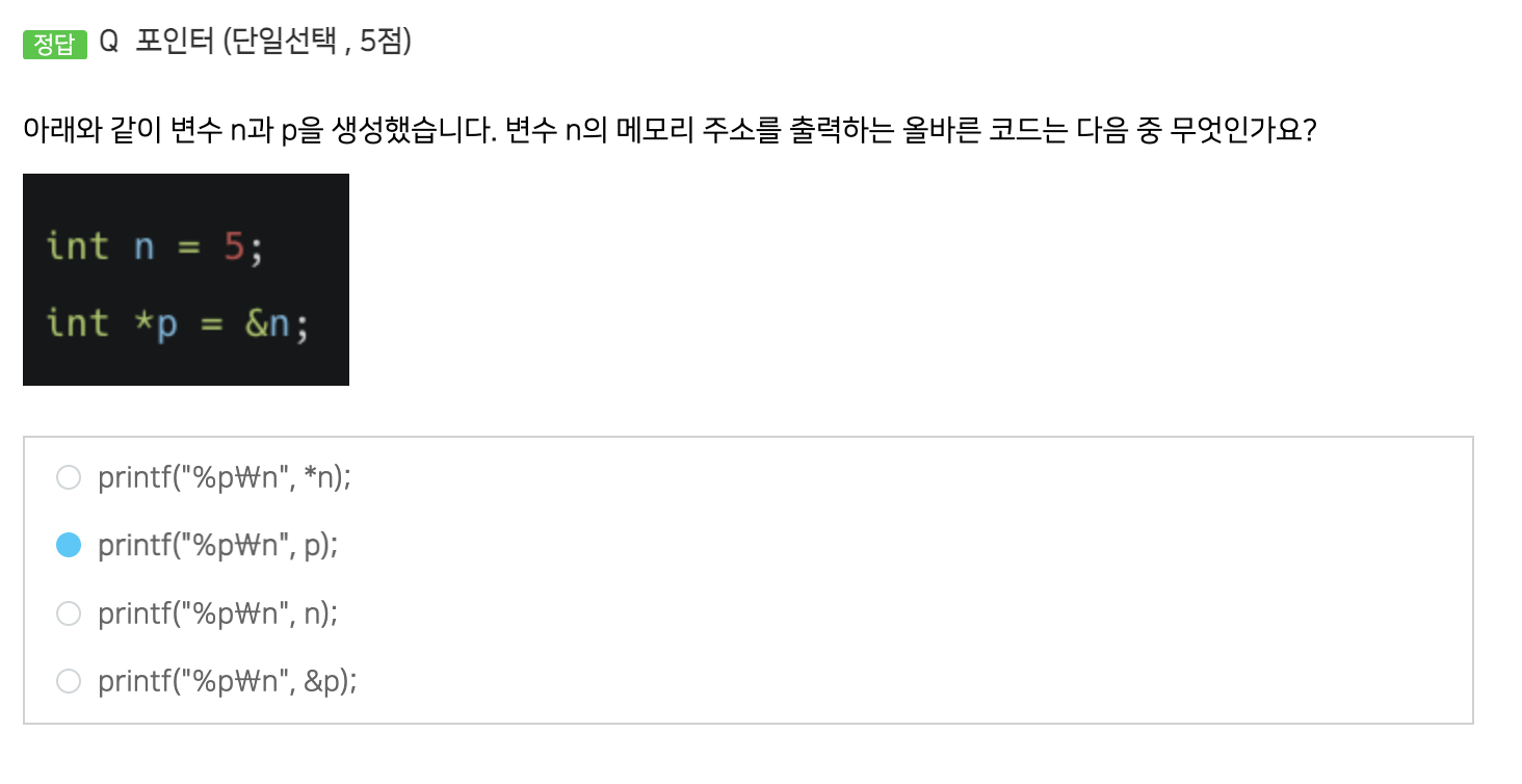 4번 선택지에서 printf("%p\n", &p)는 포인터 변수 p 자체의 주소를 출력하고 printf("%p\n", p); 는 변수 n의 주소를 출력한다. 즉 서로 다른 주소 값을 출력한다.