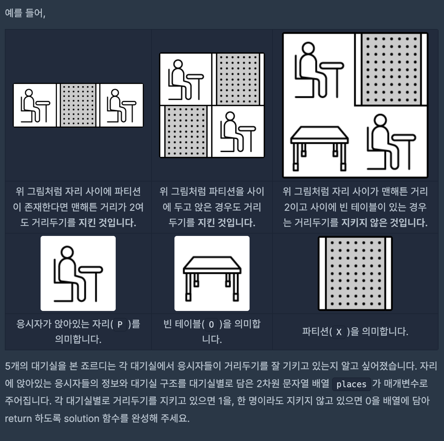 1️⃣ 대기실 안에 n번째 행에 면접자("P") 가없으면 continue isNotParticipantInRow()