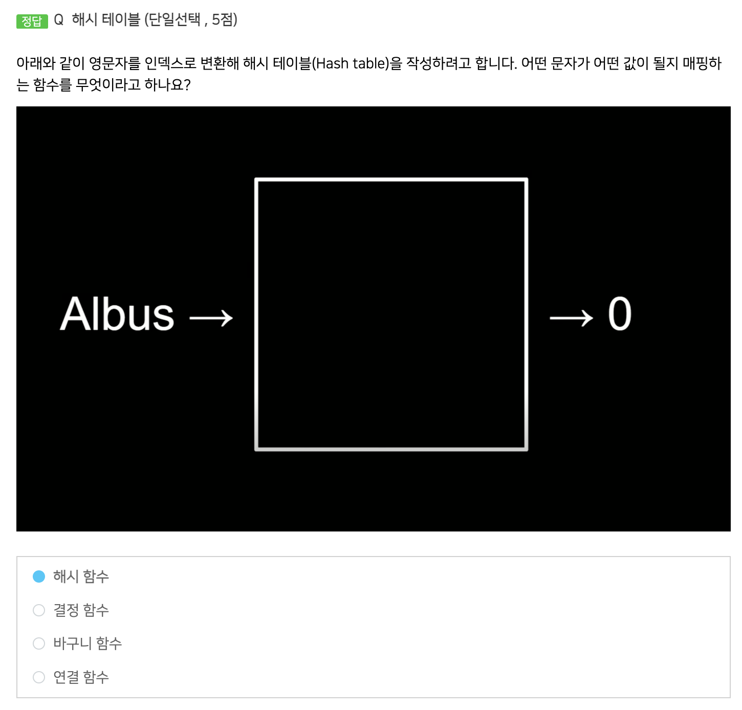 - 해시 테이블은 최악의 경우 단 하나의 바구니에 모든 값들이 담겨서 O(n)이긴 하지만 해시 함수가 이상적이라면(최대한 많은 바구니에 담으면) 거의 O(1)에 가깝다.