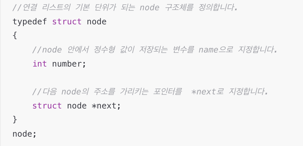 연결 리스트는 아래 코드와 같이 간단한 구조체로 정의할 수 있다.