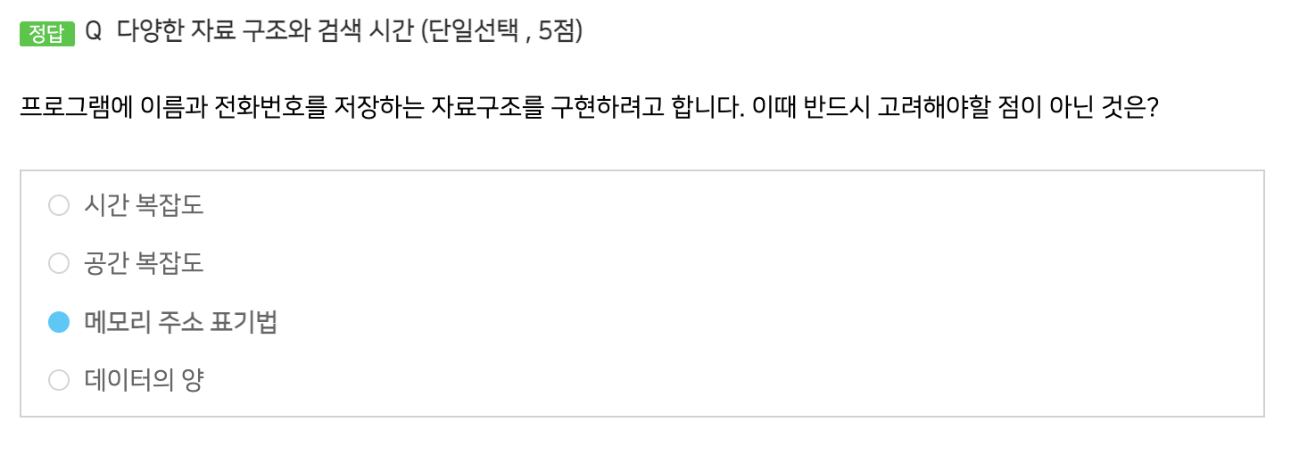 - 시간 복잡도 : 자료 구조에따라 속도는 빠르지만 메모리가 많이 필요한 경우가 있고 속도는 느리지만 메모리가 적게드는 경우등 다양하기에 빠르게 처리해야하는지 느리게 처리해야하는지등 자료구조를 구현할 때 꼭 고려해야할 사항 중 하나이다.