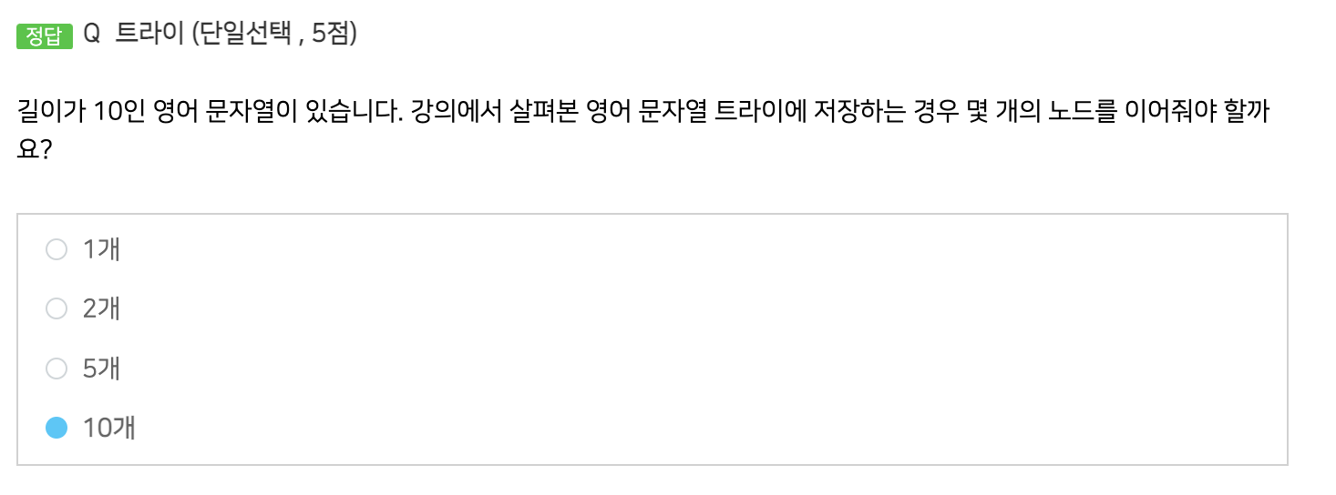 - 트라이는 영어 이름의 길이를 n이라고 했을 때, 검색 시간은 O(n)이 되지만 , 대부분의 이름은 그리 크지 않은 상수값(예, 20자 이내)이기 때문에 O(1)이나 마찬가지이다.
