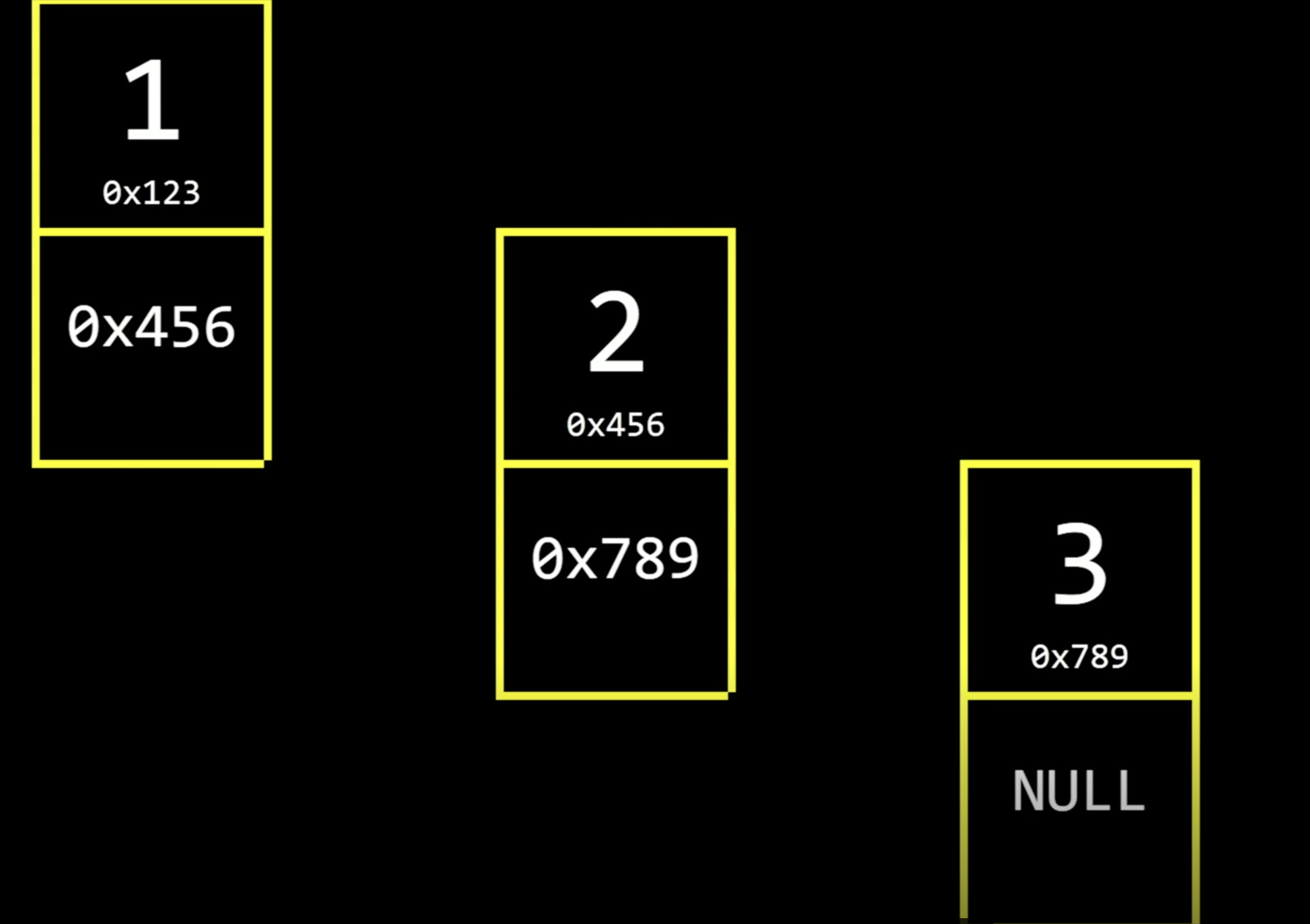 아래 그림과 같이 크기가 3인 연결리스트는 각 인덱스의 메모리 주소에서 자신의 값과 함께 바로 다음 값의 주소(포인터)를 저장한다.