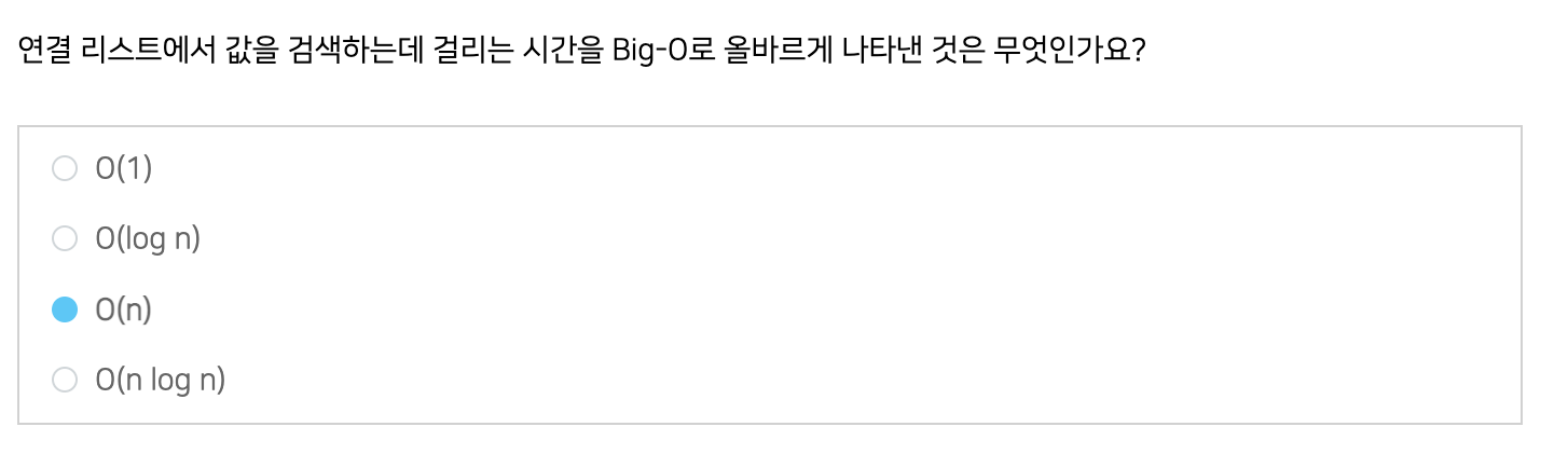 - 연결 리스트는 원하는 값을 찾을 때 까지 노드를 타고 타고 들어가야 해서 O(n)이다.