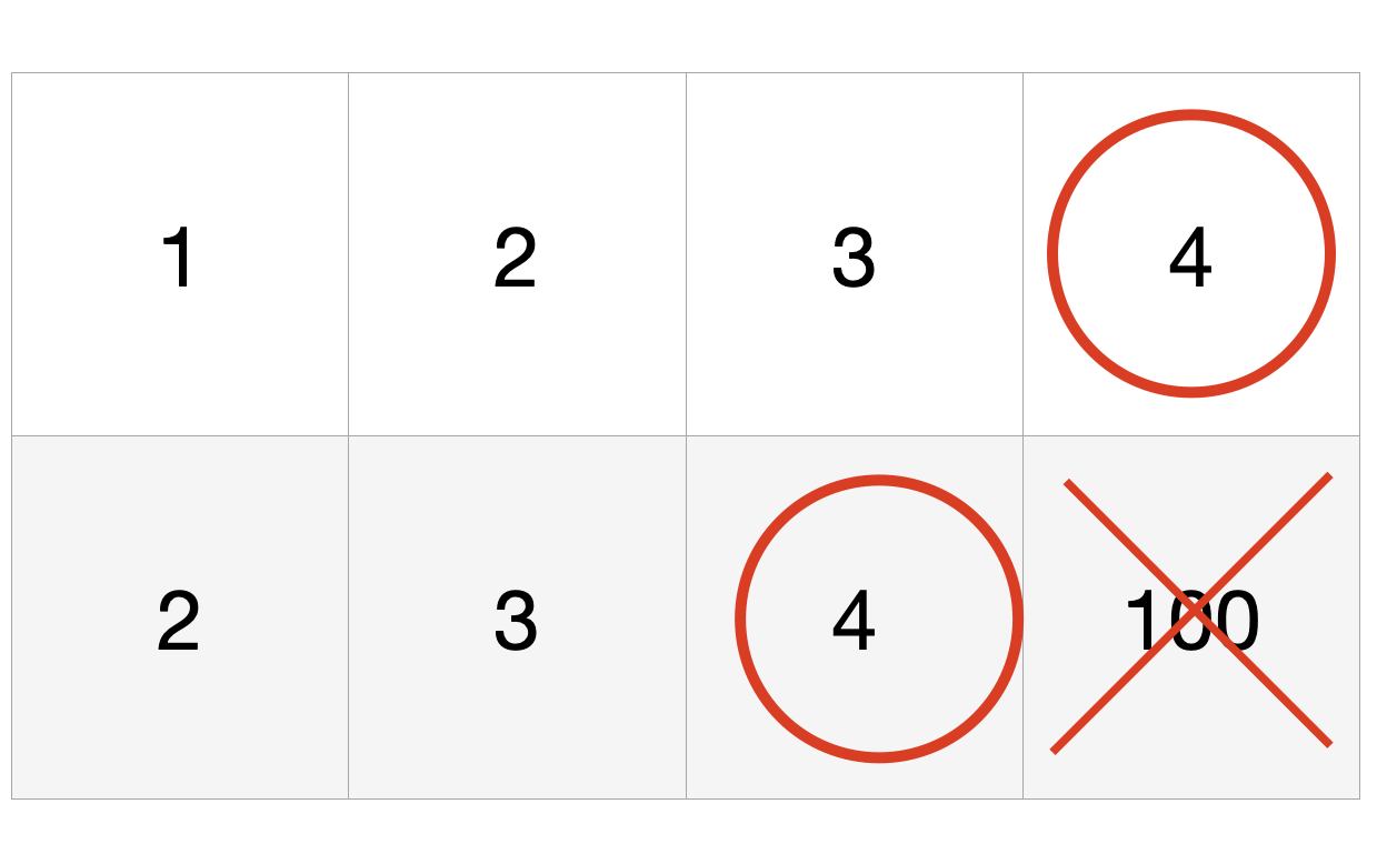 간단한 예시로 첫 번째 행에서 최댓값인 4를 고르면 두 번째 행에서 100을 고를 수 없기 때문에 이 부분도 고려해야 합니다.