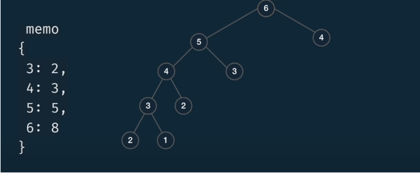예를들어 `fib(6)`를 실행 하면 아래처럼 한 번 호출된 함수의 결과값은 전부 메모가되어서 재호출되면 이전처럼 맨 마지막까지 호출되지 않습니다.