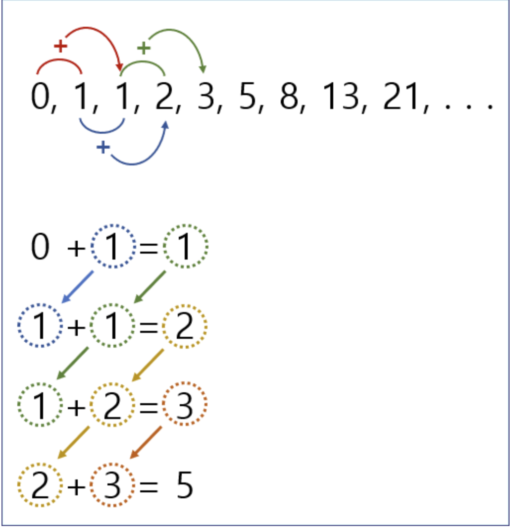 피보나치 수열 : 앞 두 개의 항목의 합이 그 다음 항목의 값이 되는 수열을 의미한다.