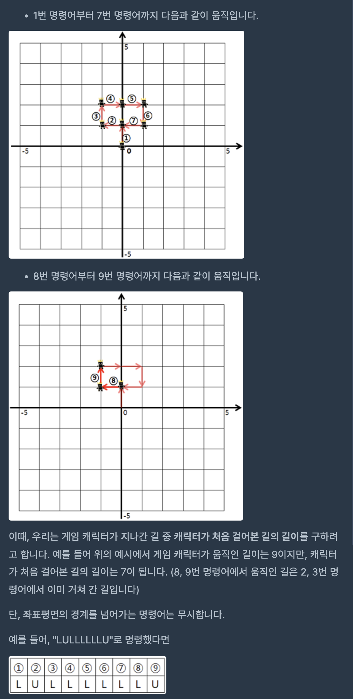 아예처음부터 출발한좌표와 도착한 좌표를 넣고 여기에 더해 이 둘의 위치를 바꿔서 한 번더 저장해서 한 번의 움직임에 왕복 경로를 모두 담았다. 예를들어서 "U" 명령어가 주어졌다면 (0,0) 에서 출발하고 (0,1) 도착했다면 S00E01 이런식으로 저장하고 그 반대인 S01E00 모두 저장해주었다. 이렇게 저장해준 이유는 왔다가 다시 돌아가는 경우를 제외시키기 위해서이다. 예를들어서 "UUUUUDDDDD" 이라면 전체 걸어본 길이는 '10'이지만 처음 걸어본 길의 길이는 '5'이다.