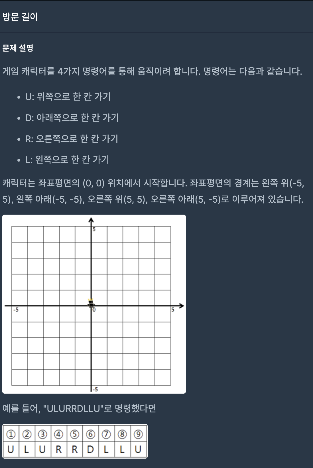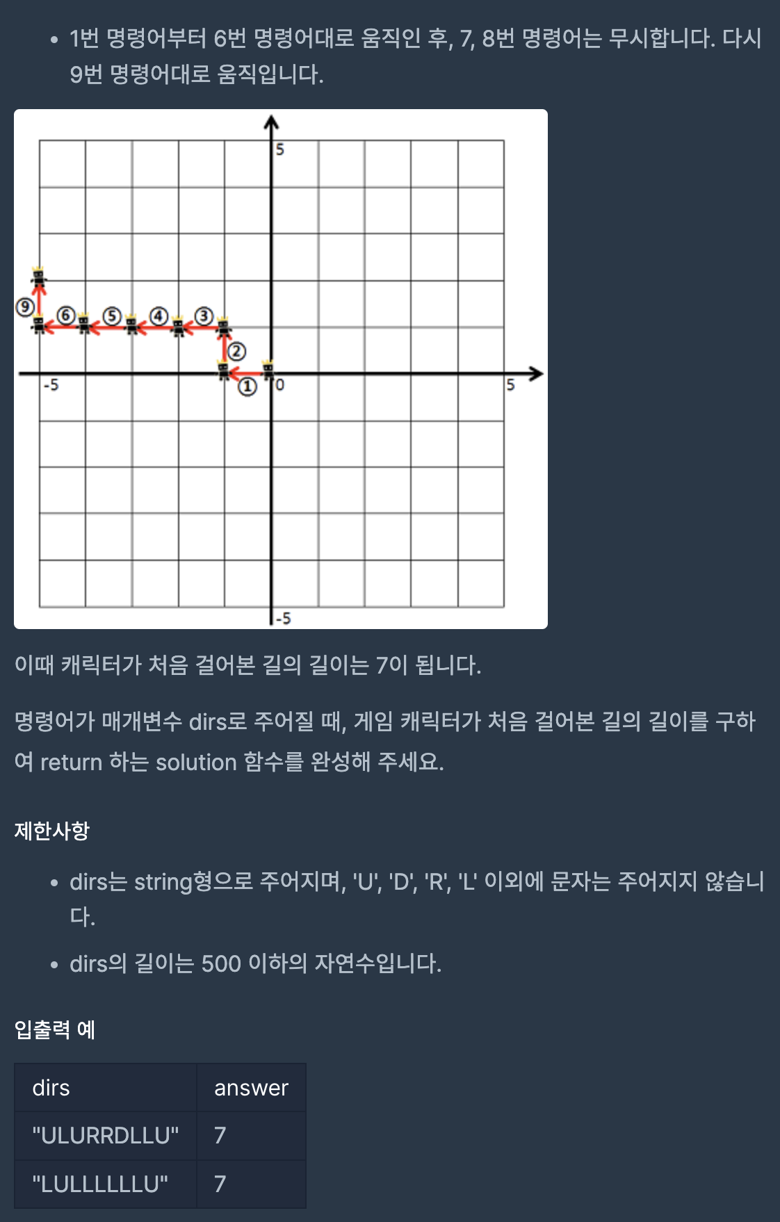 왜냐하면 도착지점의 좌표가 없을때만 answer +=1 이런식으로 체크를 하는데 1번 예제에서는 7번째 명령어를 수행할 때 (0,1) 좌표가 이미 존재해서 answer += 1이 작동하지 않는다.