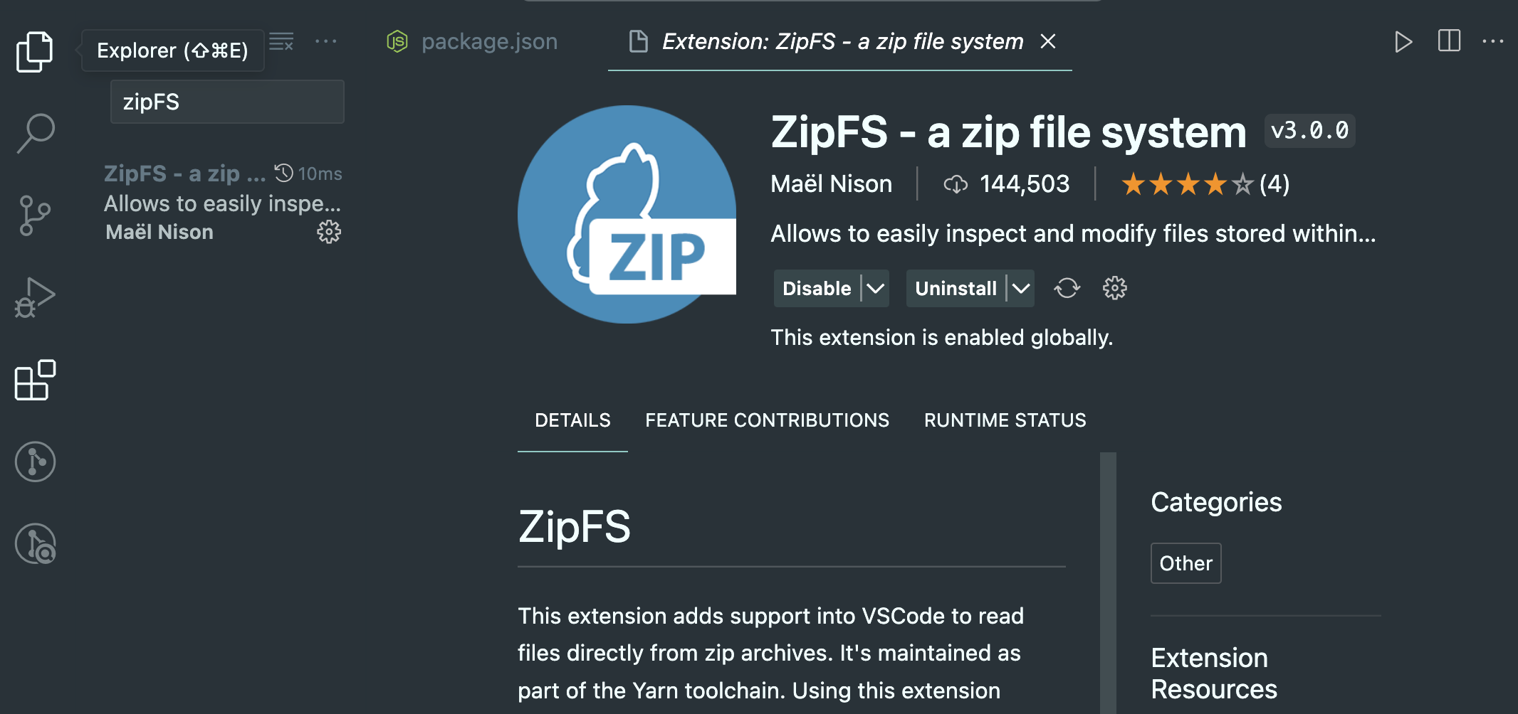 yarn에서는 패키지들이 압축되어져 있는 상태이기 때문에 vscode에서 참조하기 위해서는 ZipFS가 필요합니다.