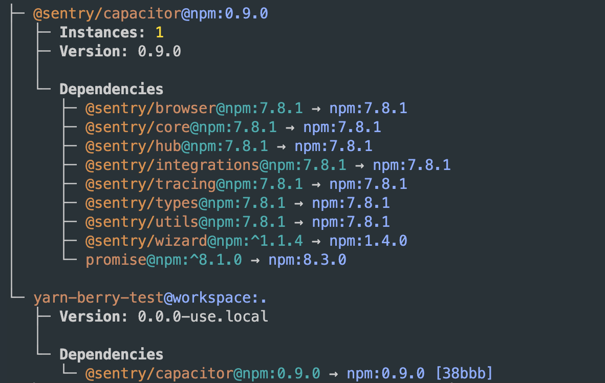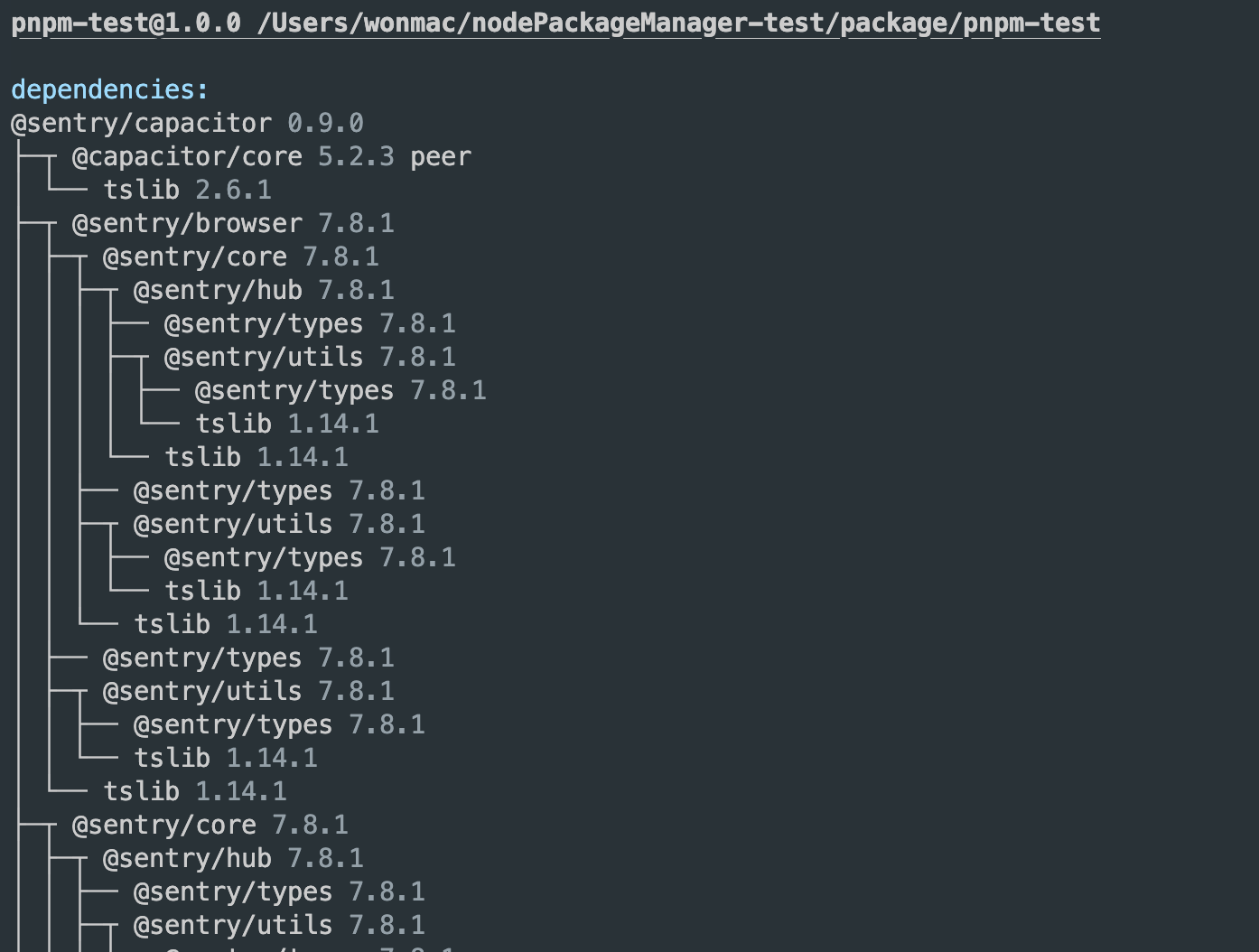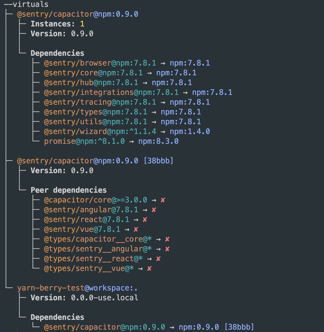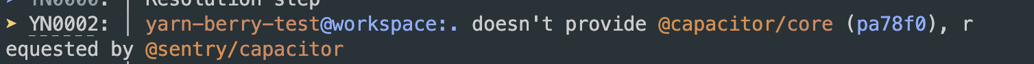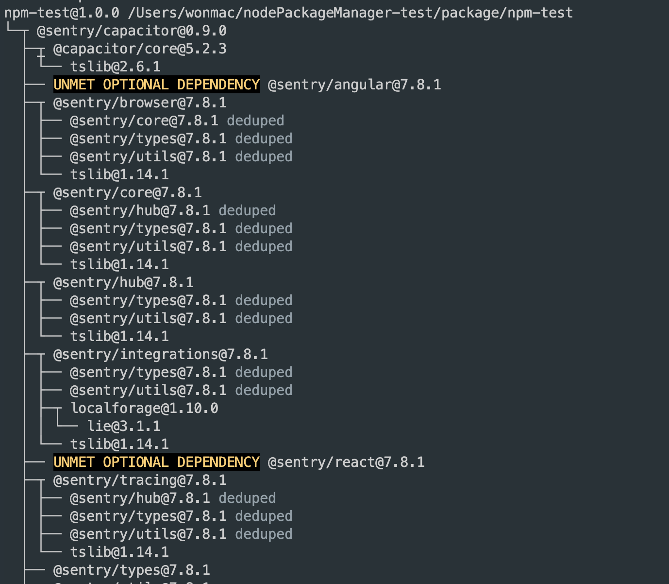 `yarn add @sentry/capacitor@0.9.0` 를 입력할 때 아래와 같이`@sentry/capacitor@0.9.0`의 `peerDependencies`에 리스트되어있는 모든 패키지가 설치되지 않았다고 가정해보자 만약 `npm`과 `pnpm`을 패키지매니저로 사용한다면 `@capacitor/core`를 최신버전으로 설치하고 나머지`@sentry/angular`, `@sentry/react`,`@sentry/vue` 는 peerDependenciesMeta가 적용되어 있어서 자동으로 설치되지 않는다. 여기서 만약 이 패키지들을 직접 설치한다면 peerDependencies에 있는 버전에 맞게 알아서 설치해준다. 하지만 `yarn`은 다르게 동작한다. 먼저 `yarn`은 `@capacitor/core`가 설치되지 않았다고 경고해준다. 또한 `@sentry/angular`, `@sentry/react`,`@sentry/vue`를 직접 설치한다면 다른 패키지들과 다르게 `peerDependencies에 리스트되어있는 버전으로 설치되는 것이아니라 최신버전으로 설치가 된다.