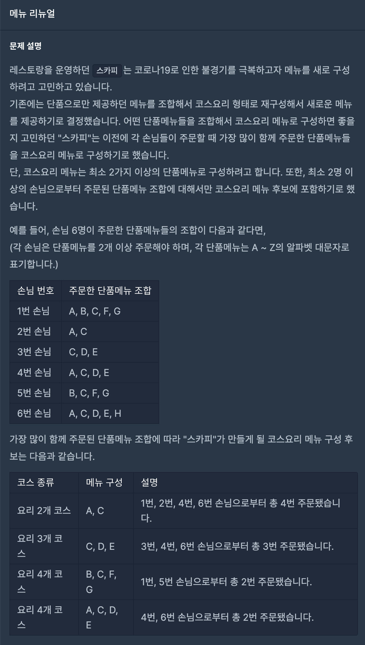 문제에 직접적으로 나와있지는 않지만 글을 잘 읽어보면 "가장 많이 함께 주문된 단품메뉴 조합에 따라 `스카피`가 만들게 될 코스요리 메뉴 구성 후보는 다음과 같습니다. "