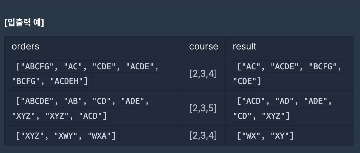 이 문제를 풀기위해서는 요리 n개 코스의 모든 조합을 구한뒤 course에 맞는 조합중에 가장 많이 주문된 조합을 고르면 됩니다.
